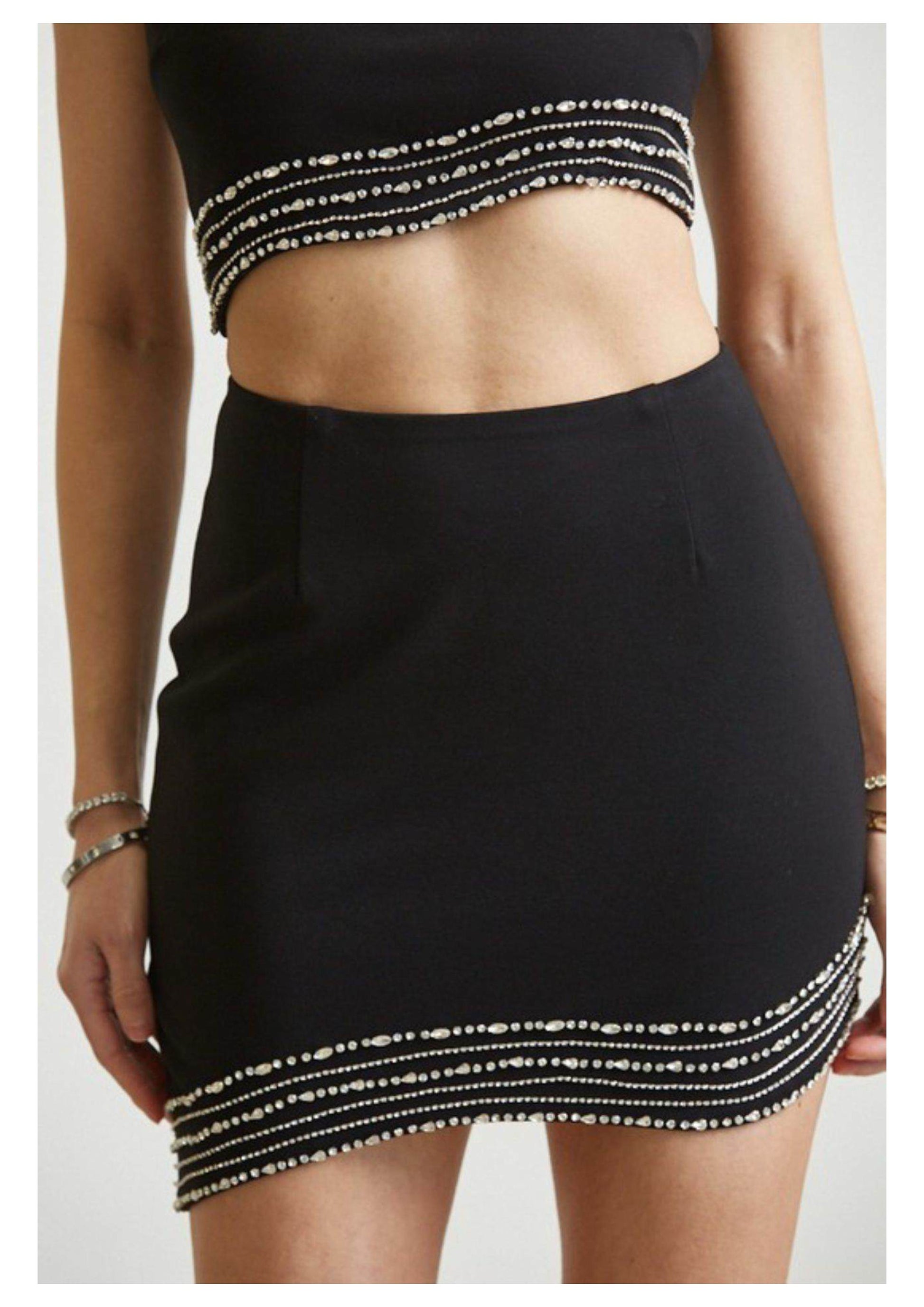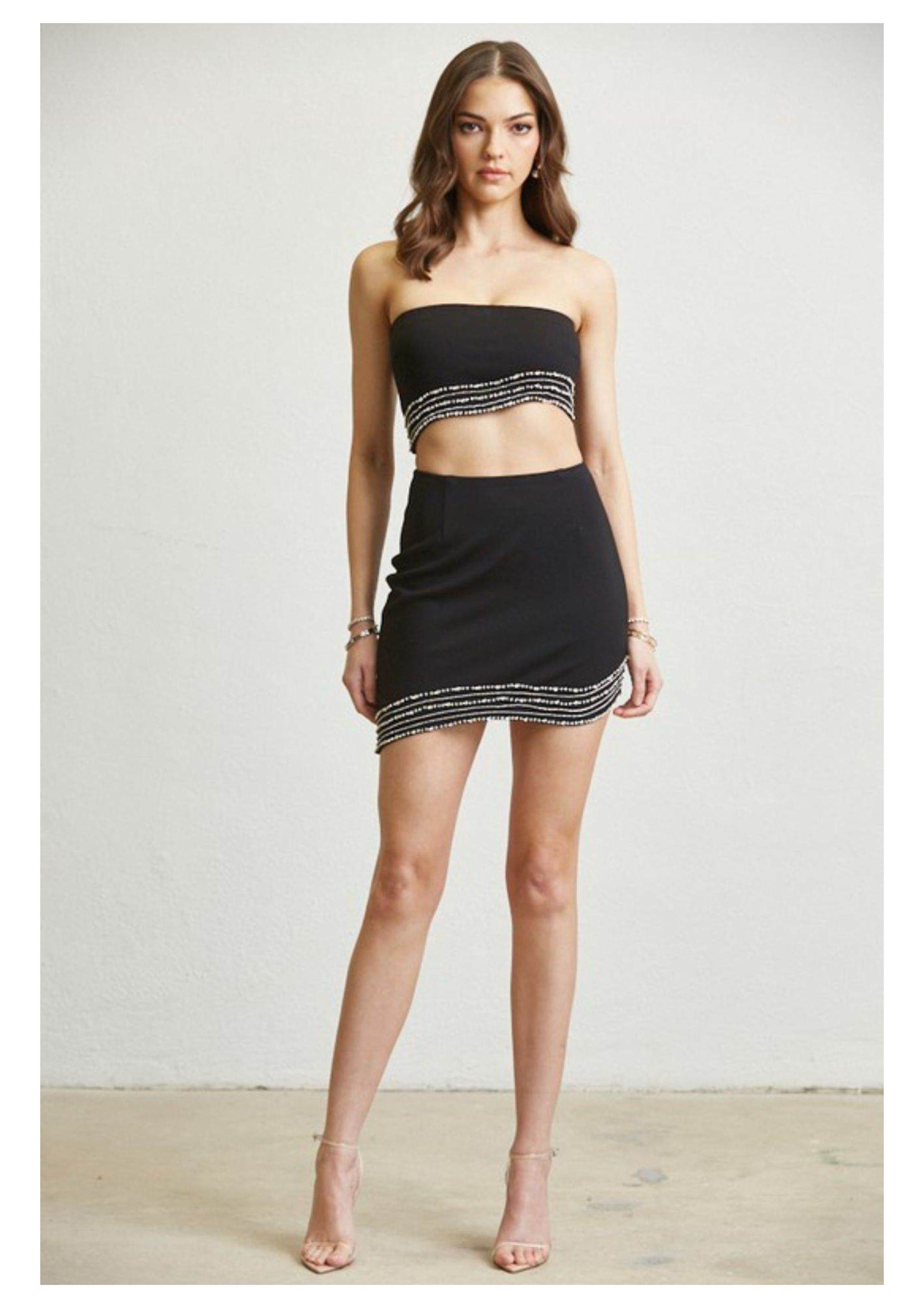 Strapless black two-piece set with crystal embellishments, featuring a bandeau top with cutout detail and a matching asymmetrical mini skirt.