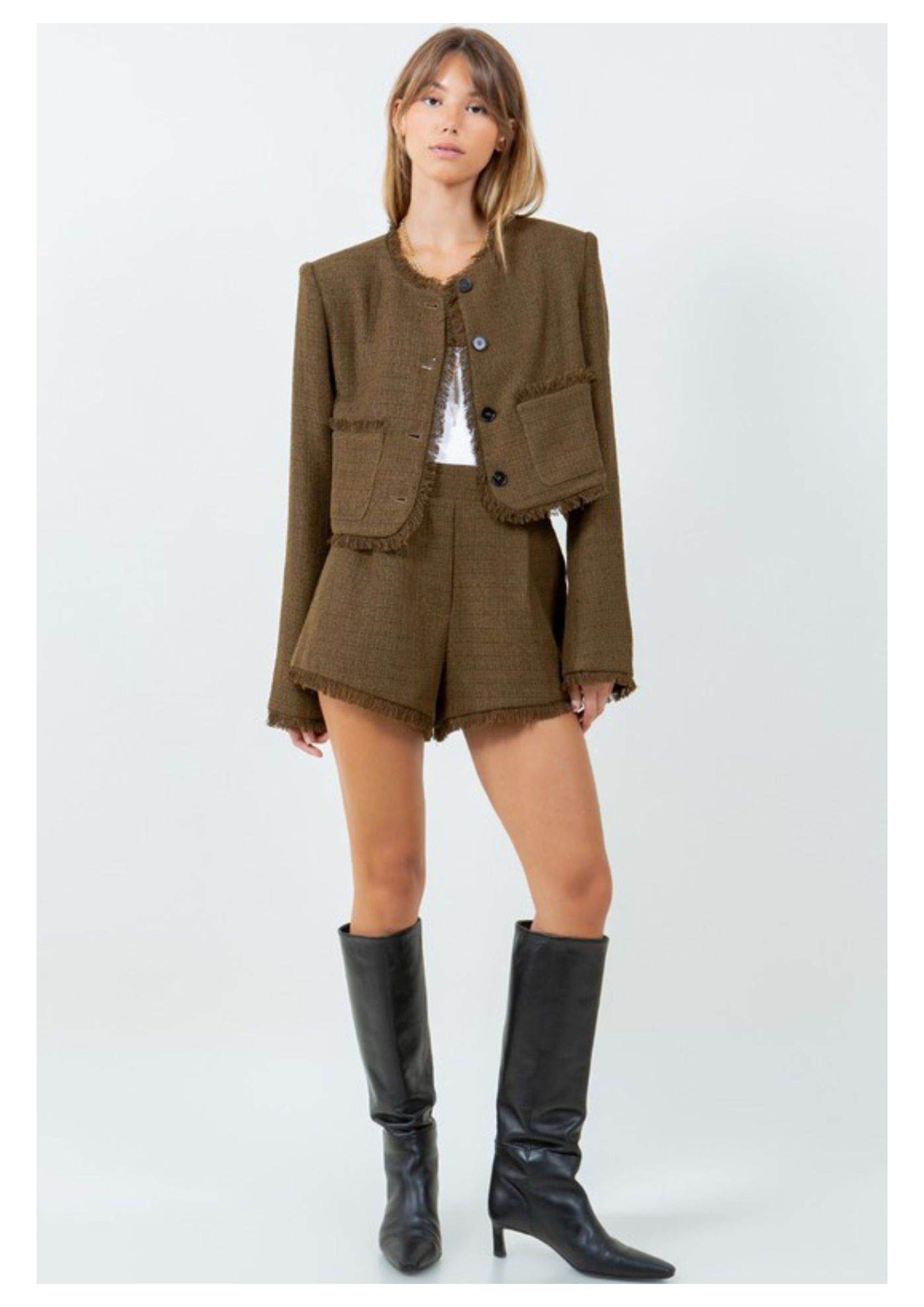 Frayed-edge tweed set with cropped jacket and matching high-waisted shorts