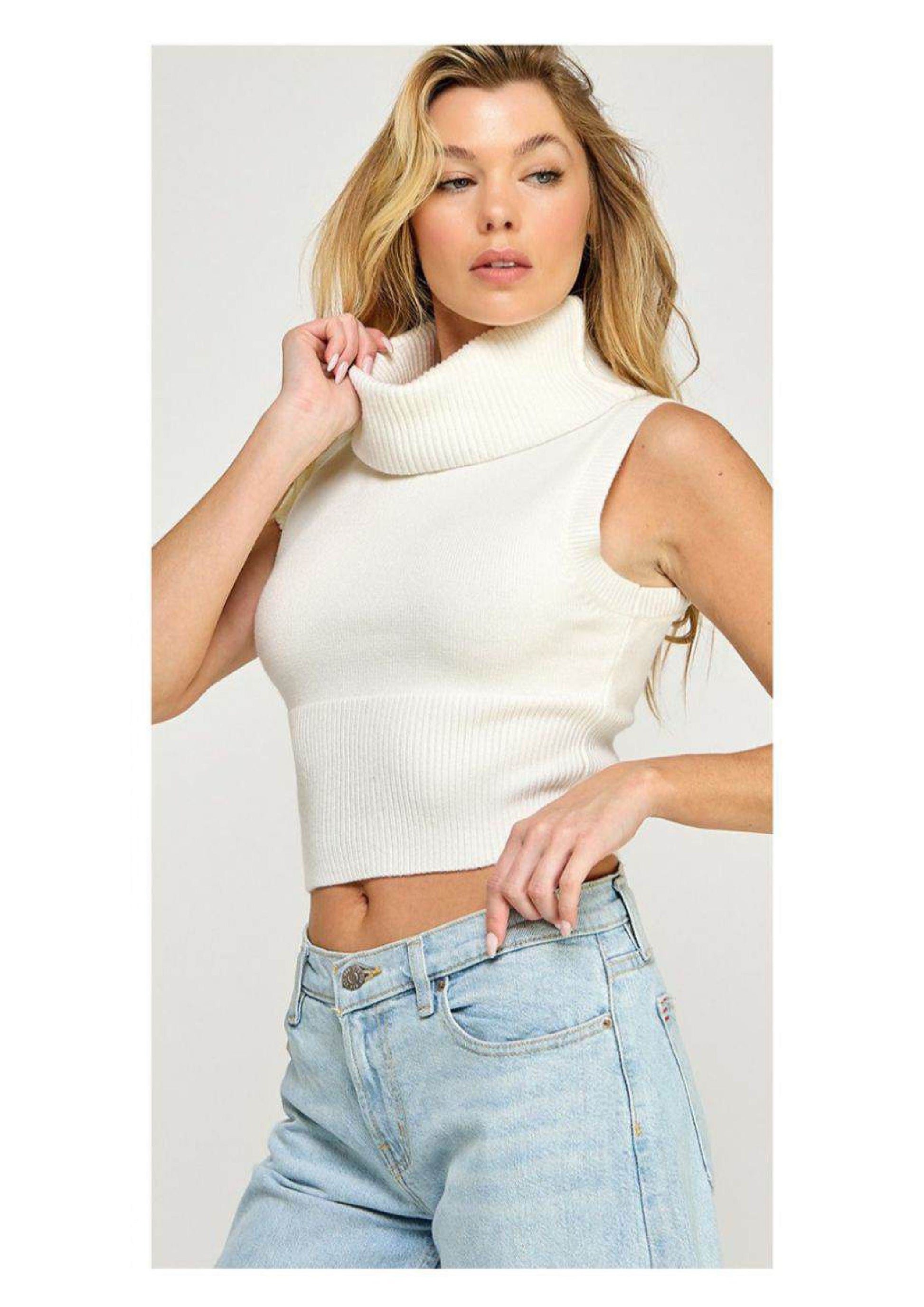 Sleeveless ivory knit top with a chunky foldover turtleneck and ribbed hemline.