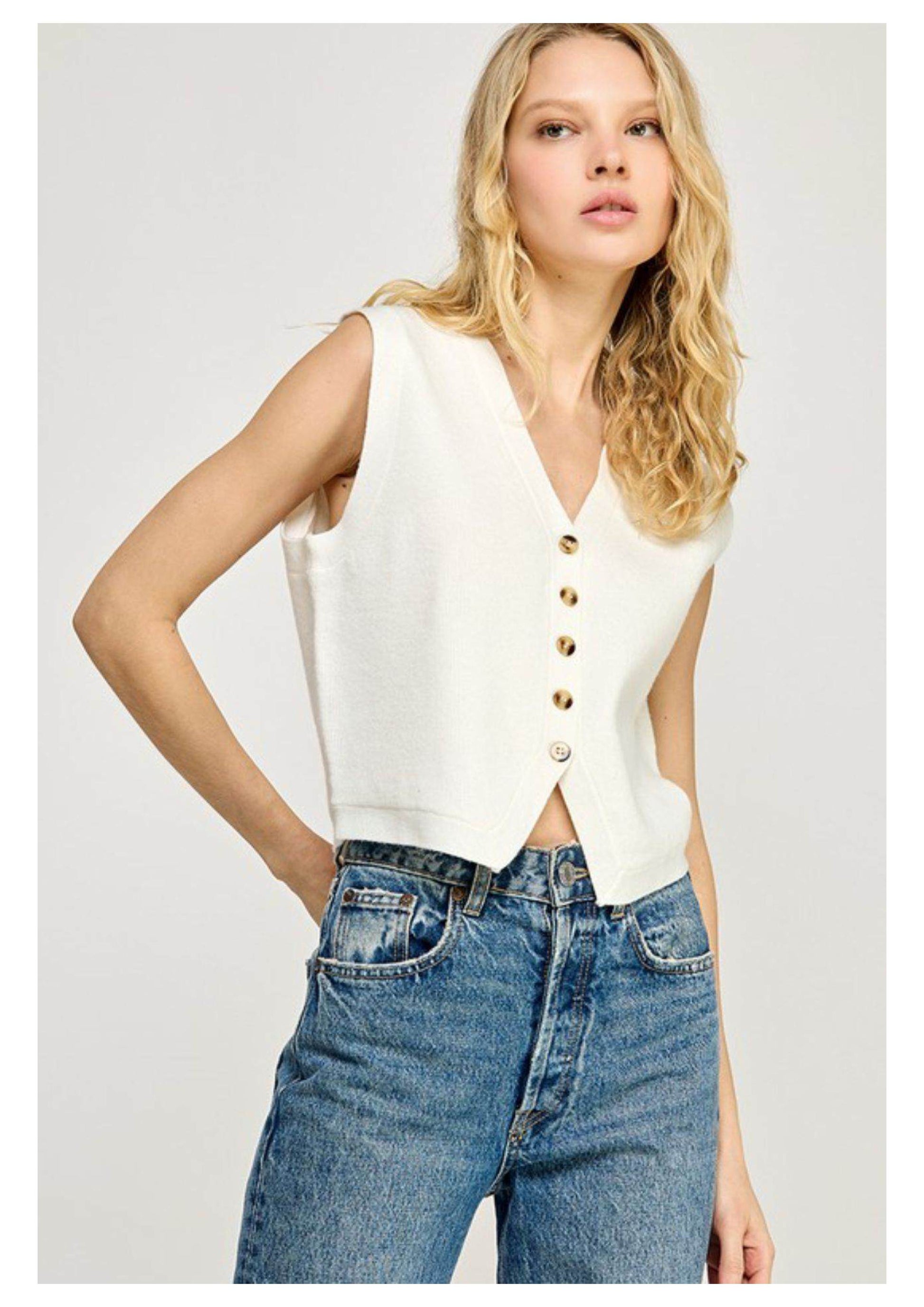 Sleeveless white V-neck knit vest with button-down front and subtle split hem, styled with high-rise jeans.