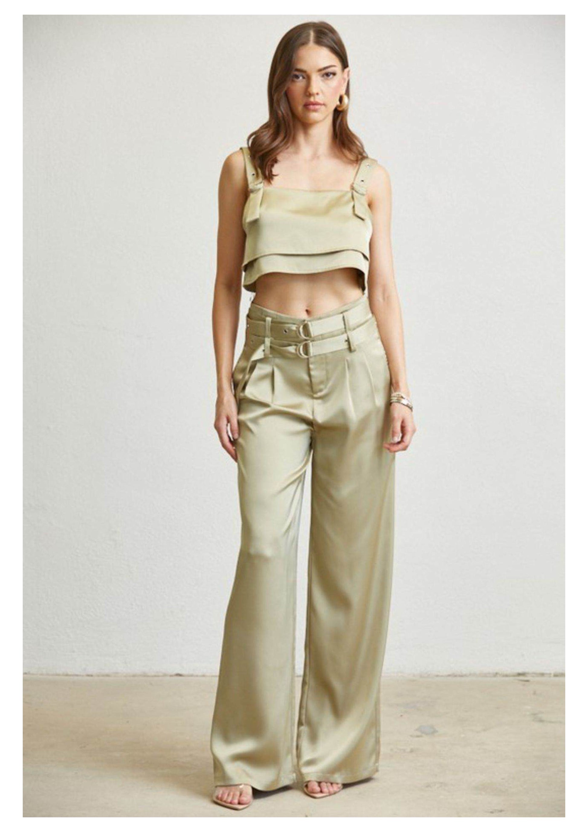 Set of layered square neck crop top with pleated high-waisted satin trousers