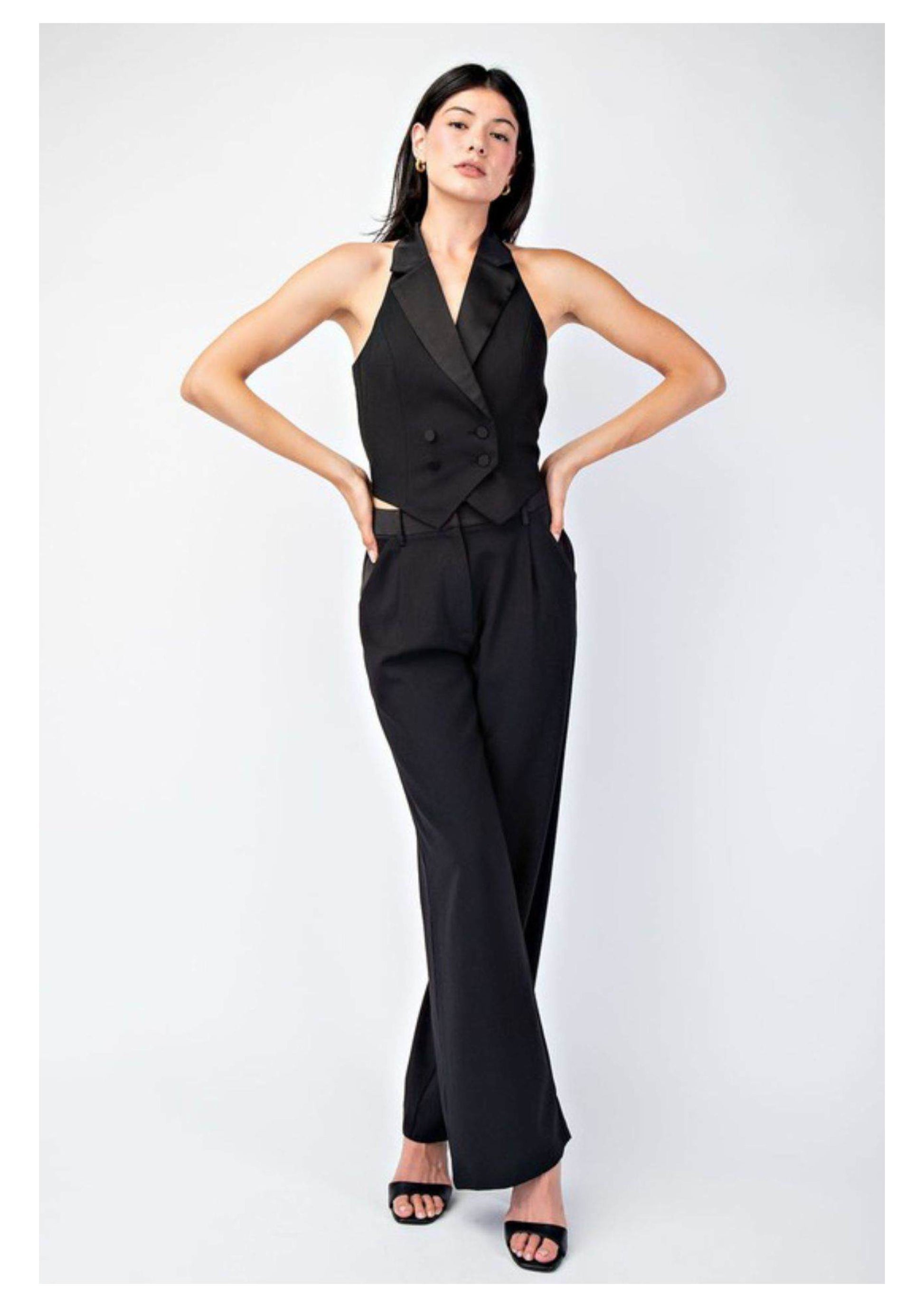 Black sleeveless tuxedo-style vest with satin lapels, double-breasted front, and tailored fit.